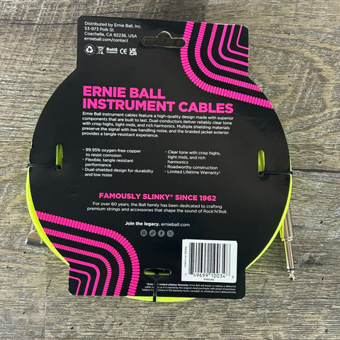 Ernie Ball Braided Instrument Cable 10’ Straight 1/4”-Angle 1/4” Neon Yellow