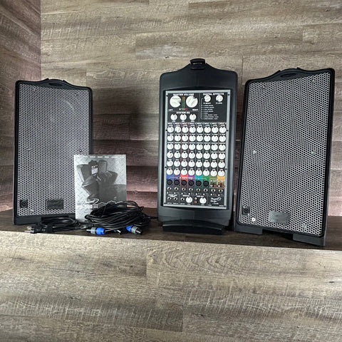- Includes: Two speakers, powered mixer, microphone, cables, and power cord