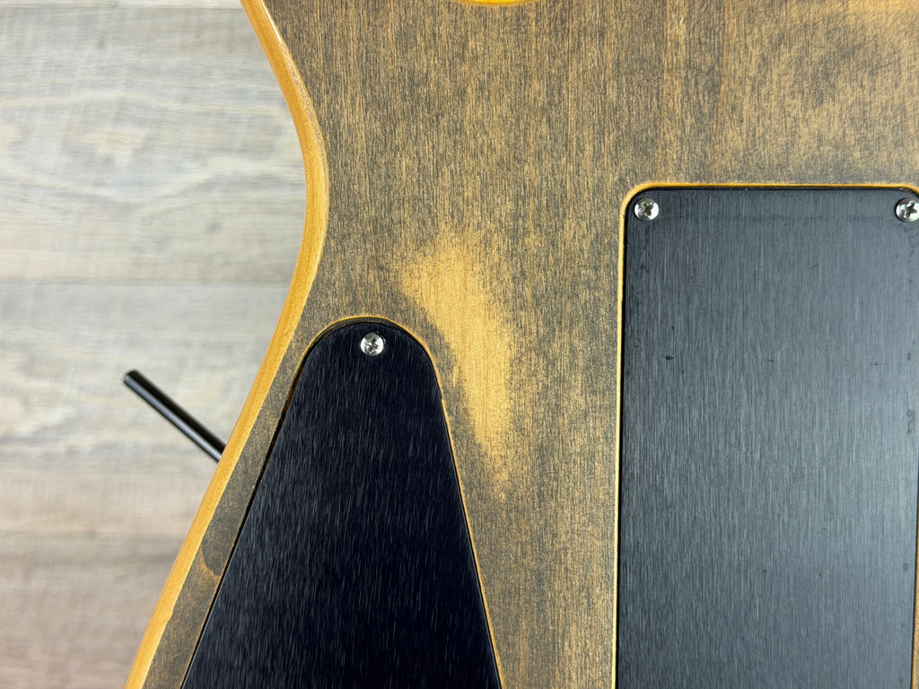 This guitar shows modification from original specification, most notably the stripped finish on the top and back and the EMG pickup installation. Structurally and functionally, however, it is in excellent playing condition with a superb setup and very clean frets.