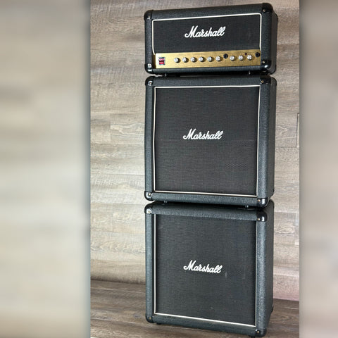 This Marshall mini stack is in very good condition, showing only minor cosmetic wear consistent with normal use. There are no major issues or damage, and all components function as intended. The actual items are pictured, and any visible wear or cosmetic marks are shown clearly in the photos provided.