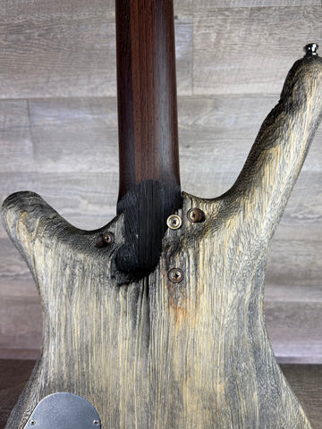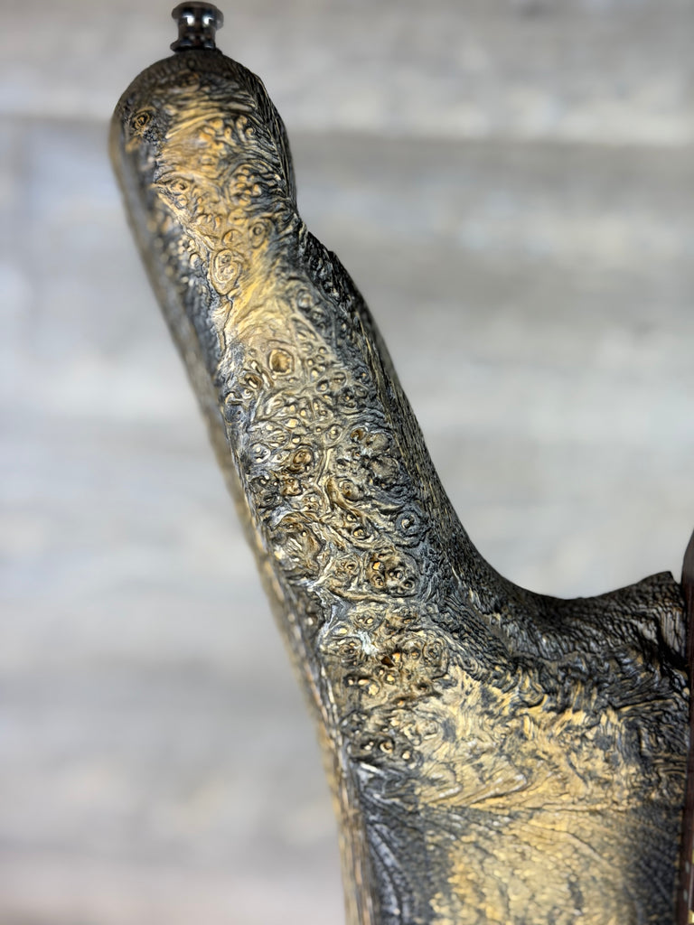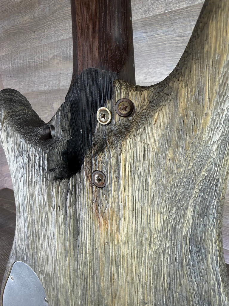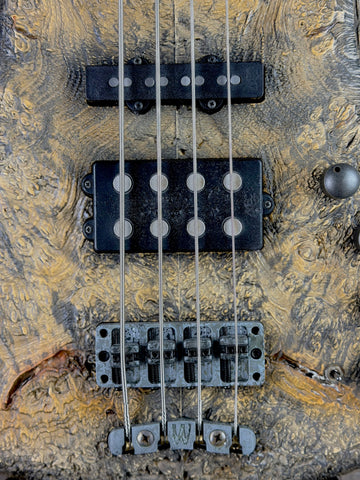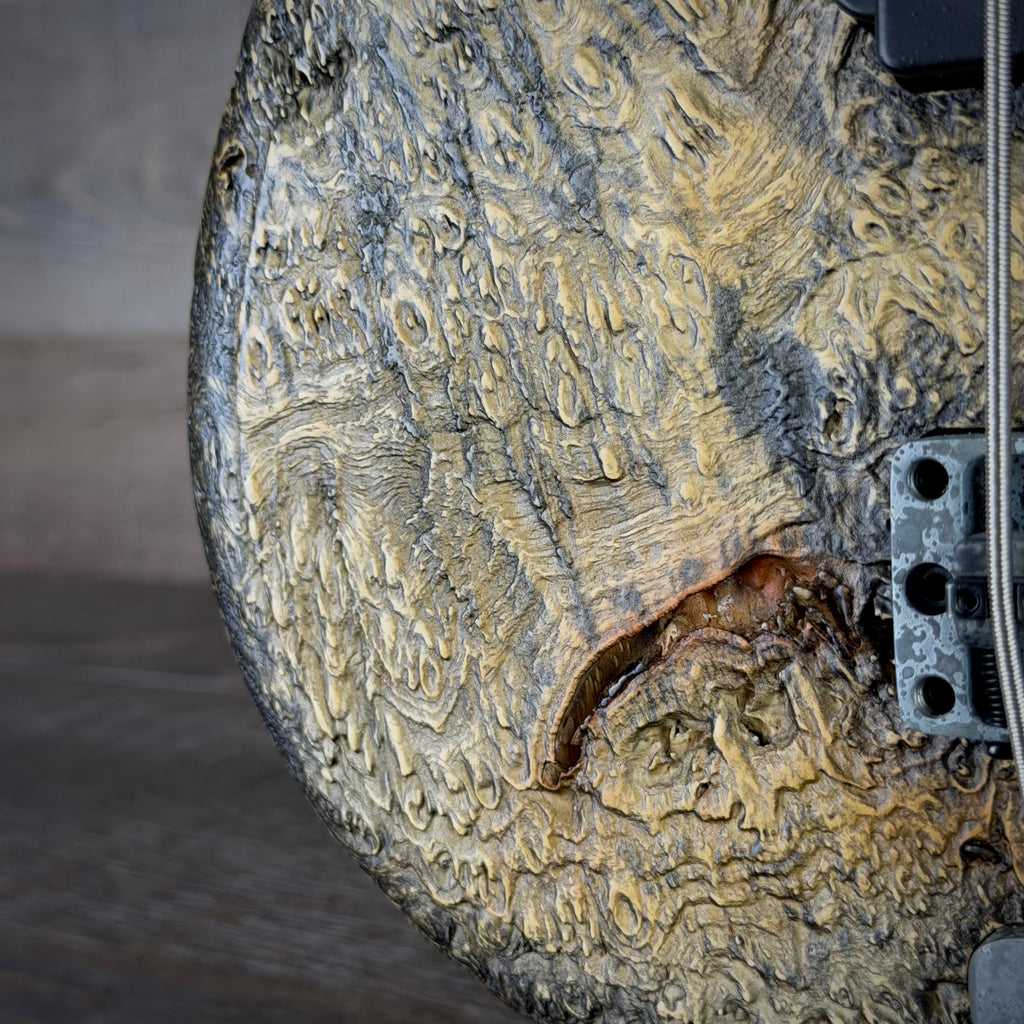 A 3/8" Black Walnut Burl top over a Black Korina body provides depth, articulation, and strong low-mid presence, while the sandblasted “Fossil” finish enhances resonance and highlights the natural grain. The result is a bass that is equally at home on stage, in the studio, or in a high-end collection.